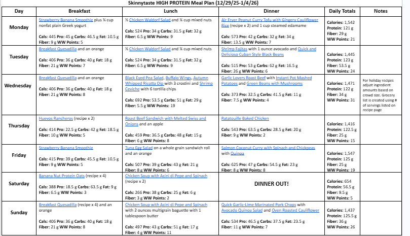 A free, 7-day high protein diet meal plan including breakfast, lunch and dinner ideas and a shopping list. All recipes include macros and Weight Watchers points.