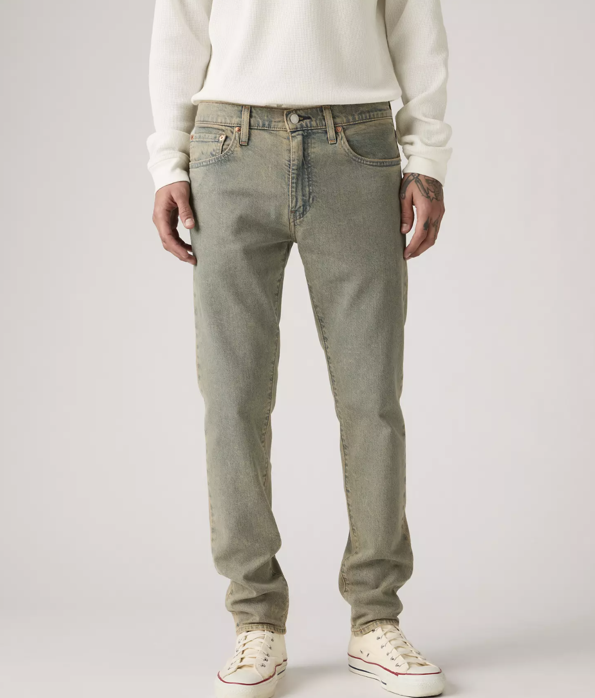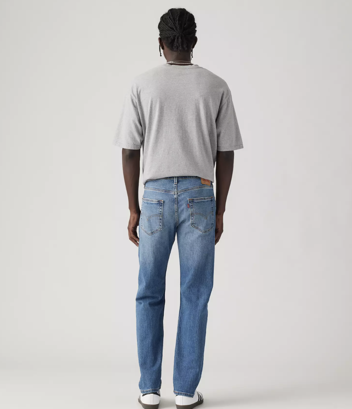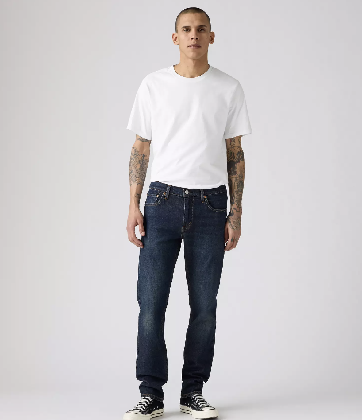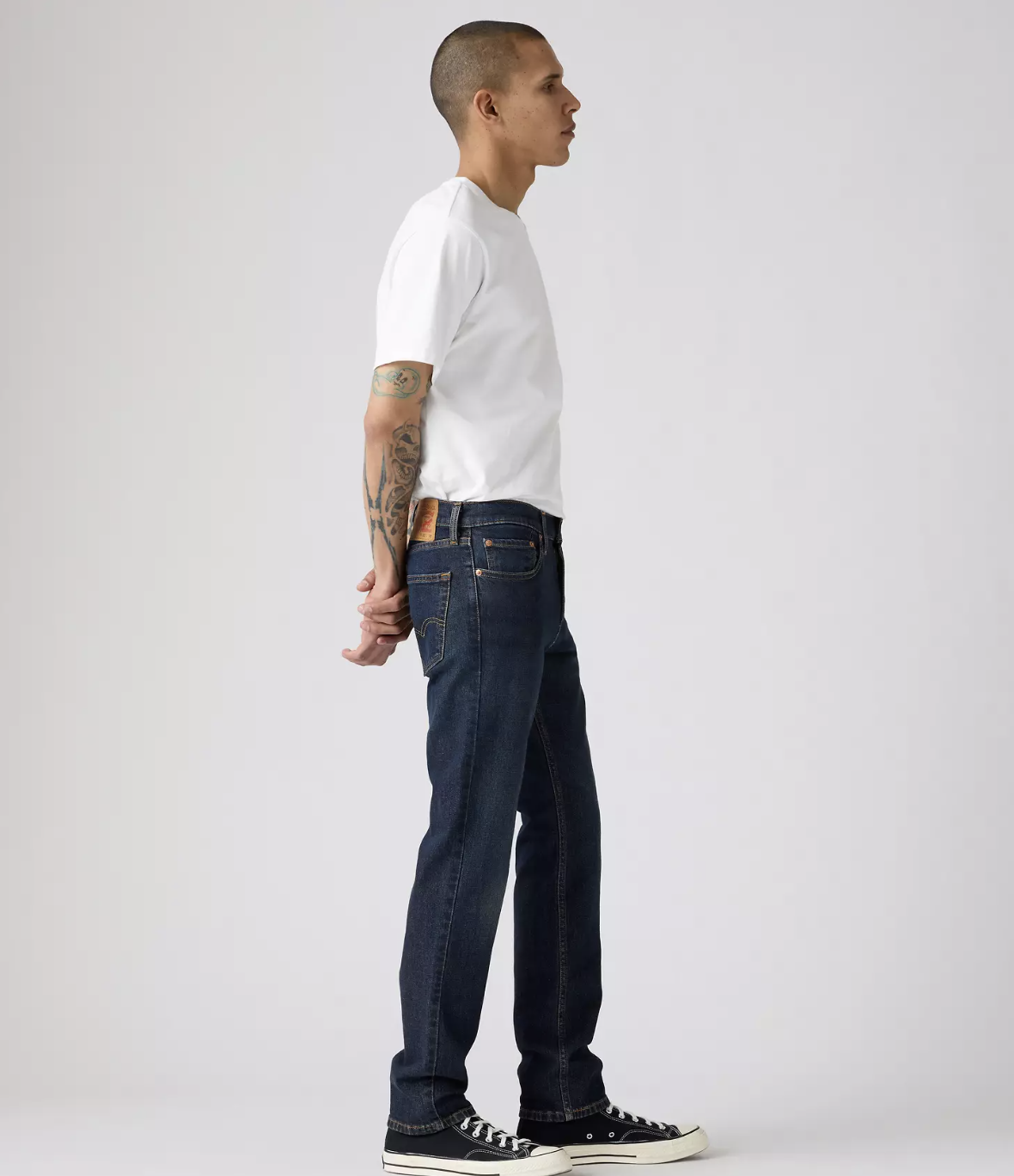 The 502 is built for men who want taper at the ankle without a slim top block. It uses a mid rise and provides more thigh room than either the 511 or 512. The leg narrows below the knee but does not create a sharp taper profile.