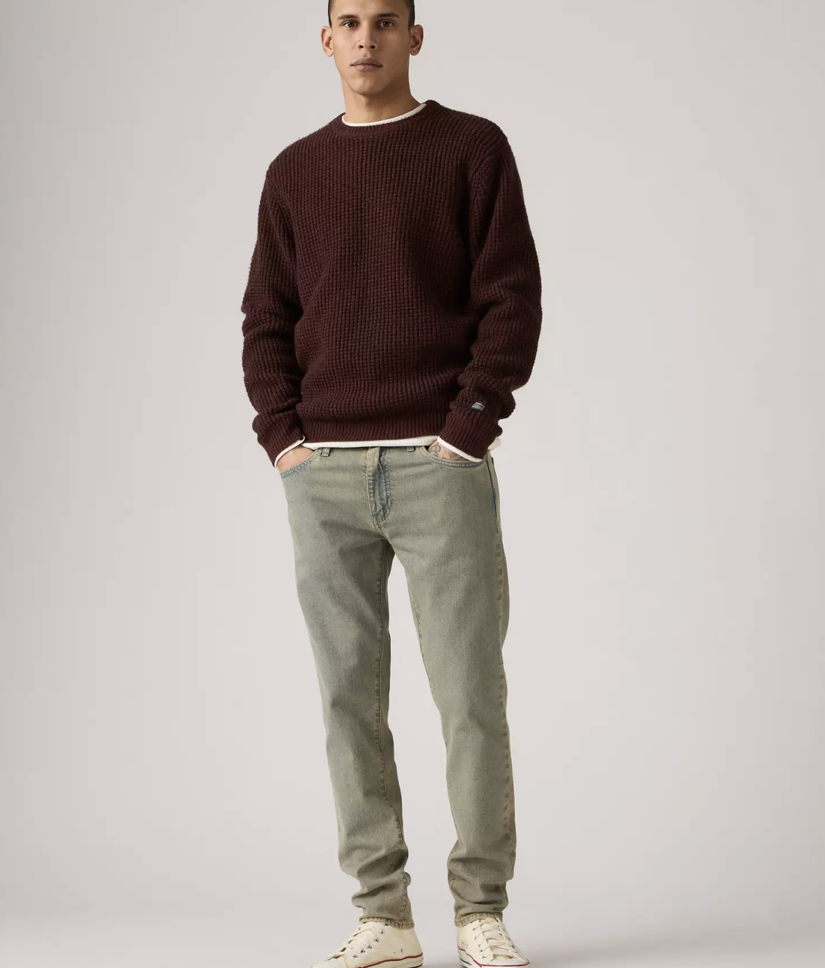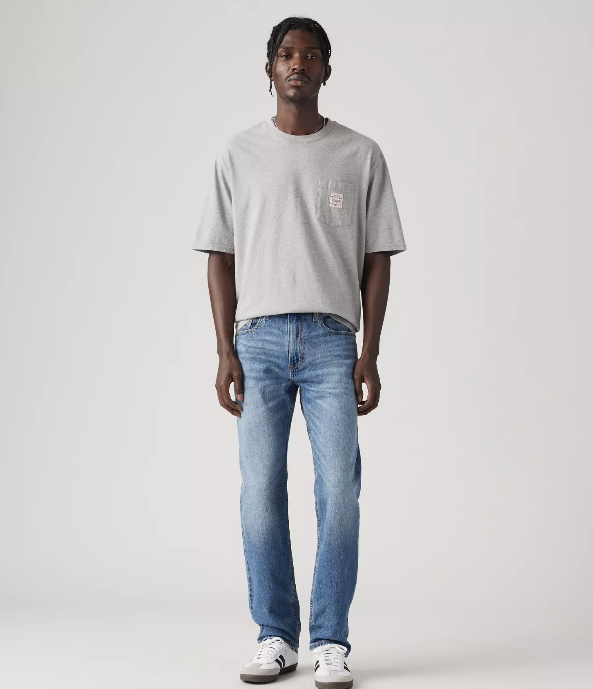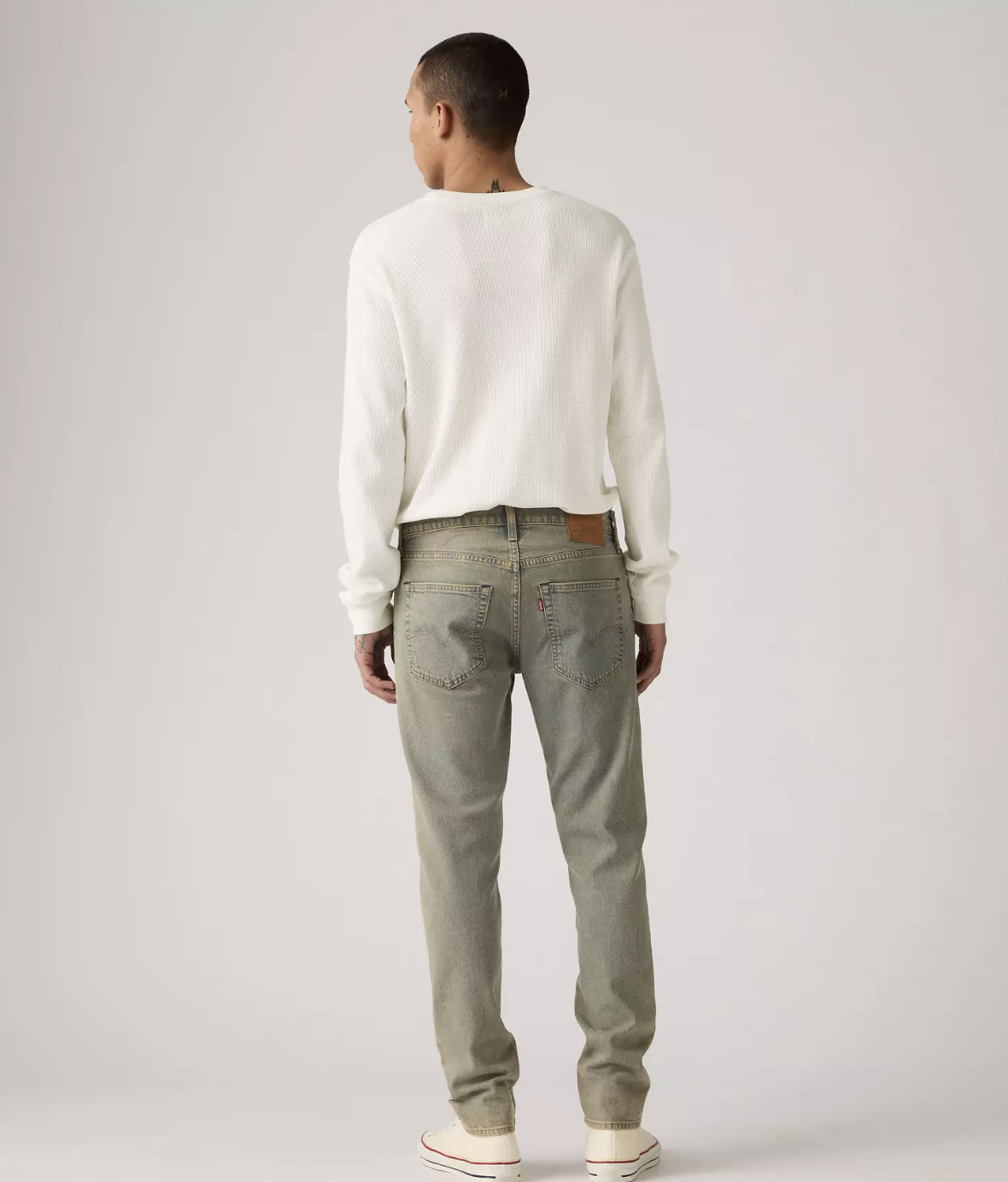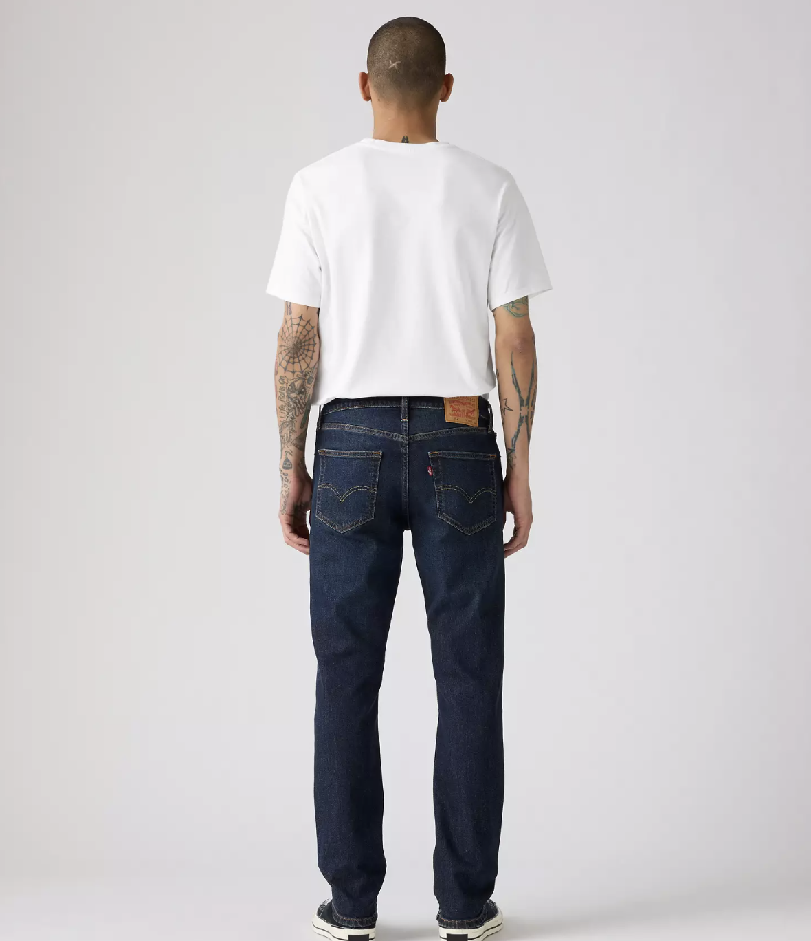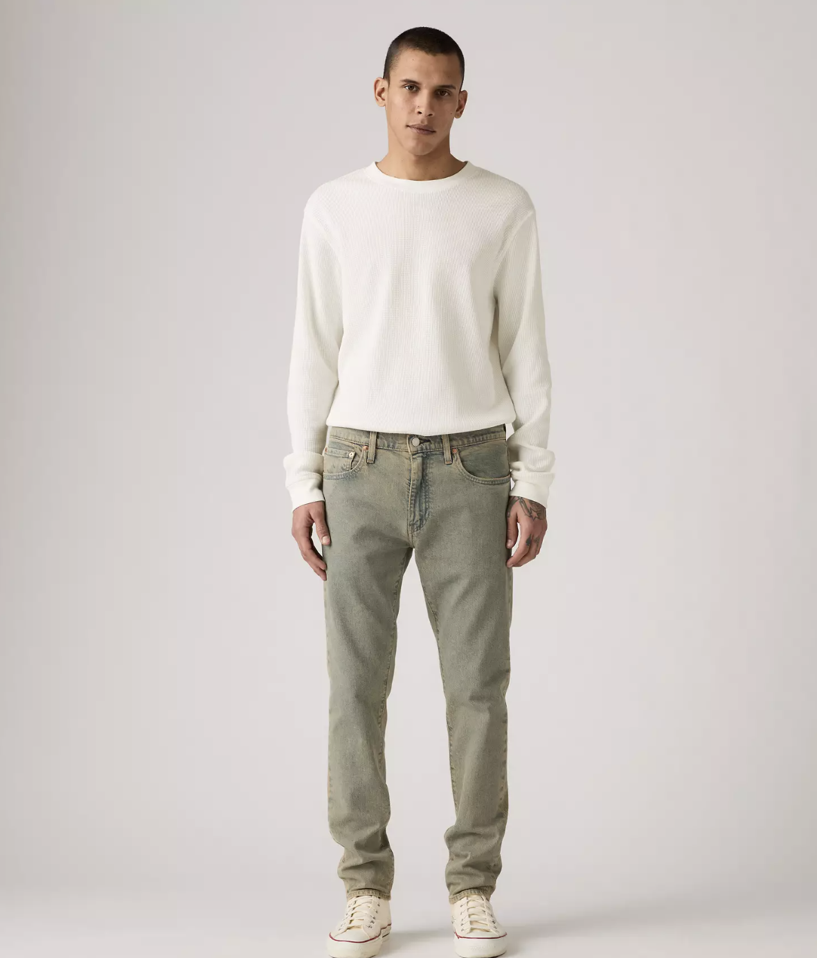 The 502 is built for men who want taper at the ankle without a slim top block. It uses a mid rise and provides more thigh room than either the 511 or 512. The leg narrows below the knee but does not create a sharp taper profile.