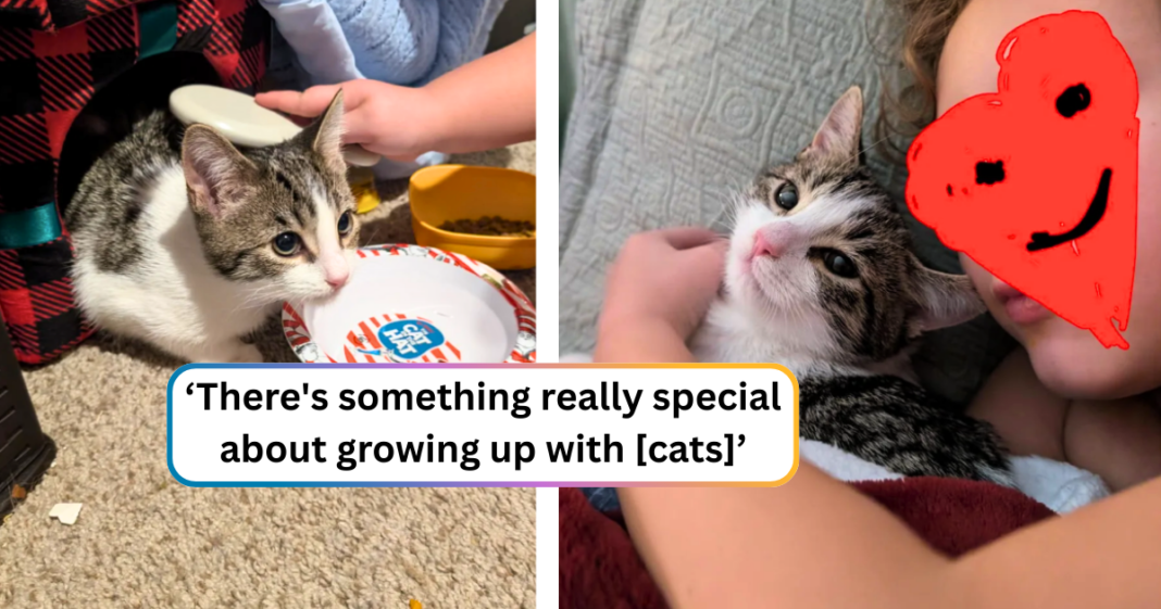 When you see the look of chill and relaxation on this kitten, all while being hugged tightly by a 7-year-old child, it can already tell you a lot about his situation. You see, if a cat wasn’t in a safe environment, one that they deem so at least, they show it very intently. One of the situations where cats might not feel safe is when they are hugged – arms around a cat might make them interpret it as a capture, a lack of possible escape routes in case of danger. But that’s their “monkey brain”, so to speak. If a cat can show this level of comfort inside a hug (and within the arms of a kid – they can be problematic with cats sometimes… depends on the kid) – you know they’re in their safe space, a good situation, and a happy home.