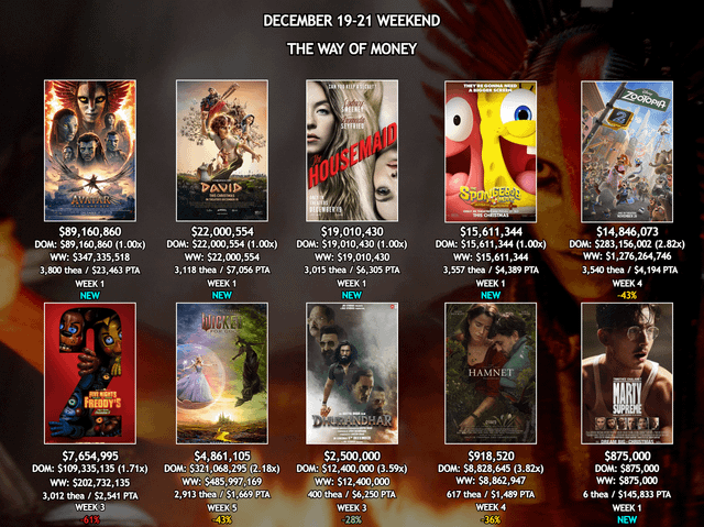 https://preview.redd.it/f6sa6je8eu8g1.png?width=1920&format=png&auto=webp&s=62d301ed6615f094503ad47ce7fc3250f2a37aaf It was a very busy weekend at the movies. Avatar: Fire and Ash easily took #1, although it is clear that the franchise has a ceiling when it comes to opening weekends. The Housemaid also posted a solid debut, while The SpongeBob Movie: Search for SquarePants didn't quite impress. But perhaps the biggest surprise was Angel Studios' David, which posted the studio's biggest ever debut. And in more positive news, A24's Marty Supreme had an incredible start in 6 theaters before its wide release on Christmas. The Top 10 earned a combined $173.4 million this weekend. That's up 23.9% from last year, when Sonic the Hedgehog 3 debuted at #1. Debuting atop, 20th Century Studios' Avatar: Fire and Ash earned $89 million in 3,800 theaters. This is below The Way of Water ($134.1 million), and above the original film ($77 million). Although given inflation and its high ticket prices, Fire and Ash sold less tickets than both films. 53% of the film's gross came from 3D, and IMAX represented 15%. This is not a bad debut, it only shows that the franchise has a ceiling when it comes to opening weekends in December. But still, how could it open $35 million below The Way of Water? For starters, The Way of Water had a novelty factor: it was the first Avatar film in 13 years. It didn't play like a normal sequel, but as a legacy sequel. As a point of reference, Jurassic World was released 14 years after Jurassic Park III, and it played the legacy angle. So Fire and Ash lacked that nostalgia angle that made people curious over returning to Pandora. Another thing is that the marketing didn't really offer much new. Yes, the point of the film is introducing the Ash people, but barring some slight differences, the film didn't really push the boundaries of fire in the same way Way of Water pushed water. It felt like just another Avatar film, without much else. Not a detriment; by this point, you're already in or out of the franchise as you know what you're gonna get. Although its real detriment was that it lacked the same positive response as the previous films; it's currently sitting at a middling 66% on RT, below both films and becoming Cameron's lowest rated film outside Piranha 2. According to 20th Century Studios, 60% of the audience was male, and 60% was in the 18-34 demographic. But it seems the film reasonated more with the audience; they gave it a strong "A" on CinemaScore, exactly the same as the prior films. It should be reiterated that a film like Avatar does not need a high debut, it's all about the holiday legs. So with very weak competition through the holidays and January, this is a film that will hold well for so many weeks. Although it's clear right now that it will close below The Way of Water ($688 million). In second place, there's this week's surprise. Angel Studios' David debuted with a pretty good $22 million in 3,118 theaters. That's the studio's best ever debut, above Sound of Freedom ($19.6 million). While Angel Studios has had a very miss rate with its recent releases, they've been pushing David harder than any other release they had. Releasing a Biblical tale just as Christmas is about to start was a smart choice. With an "A" on CinemaScore, this should hold well for the next weeks. In third place, Lionsgate's The Housemaid debuted with a pretty solid $19 million in 3,015 theaters. That's obviously nowhere close to what It Ends with Us ($50 million), another popular adaptation, opened with, but at least it was better than Regretting You ($13.6 million). After some rough months with very few successes, Lionsgate did a great job in prioritizing The Housemaid and successfully translating the novel's popularity to the big screen. All the trailers did a great job in building the mystery and intrigue, pretty much keeping the same tone as the novel. Good reviews (75% on RT) also helped it. According to Lionsgate, 70% of the audience was female, and 63% was in the 18-34 demographic. They gave it a "B+" on CinemaScore, which is fine for a film like this. Given the Christmas corridor will result in great legs, there's a good chance it will hit $100 million domestically. In fourth place, The SpongeBob Movie: Search for SquarePants debuted with $15.6 million in 3,557 theaters. This number is below the 2004 film ($32 million) and the 2015 sequel ($55.3 million), by quite a margin. The SpongeBob brand is clearly popular, given that it has managed to stay relevant for 26 years. But perhaps the reason why Search for SquarePants opened too low is that brand is past its prime. It's definitely popular, just not as high as it was years ago. The amount of bad seasons are a huge factor, but the spin-off projects sent so streaming only helped dilute the brand a little bit. So are parents really interested in taking their kids to a SpongeBob movie in theaters when they already have a lot of content on streaming and TV? The surprising performance of David certainly didn't help. According to Paramount, 53% of the audience was male. It's a kids movie, but its biggest demographic was 18-34, which represented 53% of its audience. Clearly, SpongeBob still attracts Gen Z. In some good news, critics liked the film (86% on RT) and audiences agreed; they gave it a pretty good "A–" on CinemaScore, the best in the franchise. Even with a low debut, it's all about the holiday legs and this should hold well, considering there won't be more animated competition till Goat in February. After leading the box office last week, Zootopia 2 dropped to fifth place with $14.8 million. But its 43% drop is very solid, and it's also higher than Moana 2's fourth weekend. The film has made $283.1 million, and it's set to enjoy some great legs for Christmas. With more strong competition, Five Nights at Freddy's 2 continued its collapse. This time, it dropped another 61%, earning $7.6 million this weekend. The film has earned $1