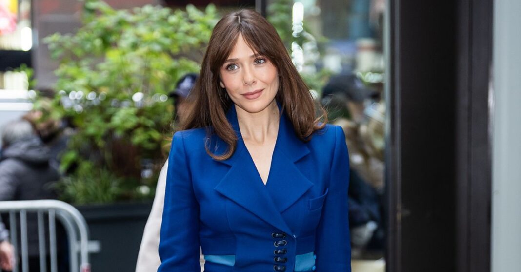 On Elizabeth Olsen: Fendi blazer, skirt, and bag; Paris Texas Burgundy Lidia Slingback Heels ($695)