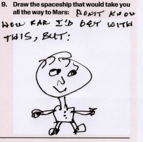 Even more unusually, one spot asks participants to “draw the spaceship that would take you all the way to Mars.” Reiner, of course, just drew that same guy again.