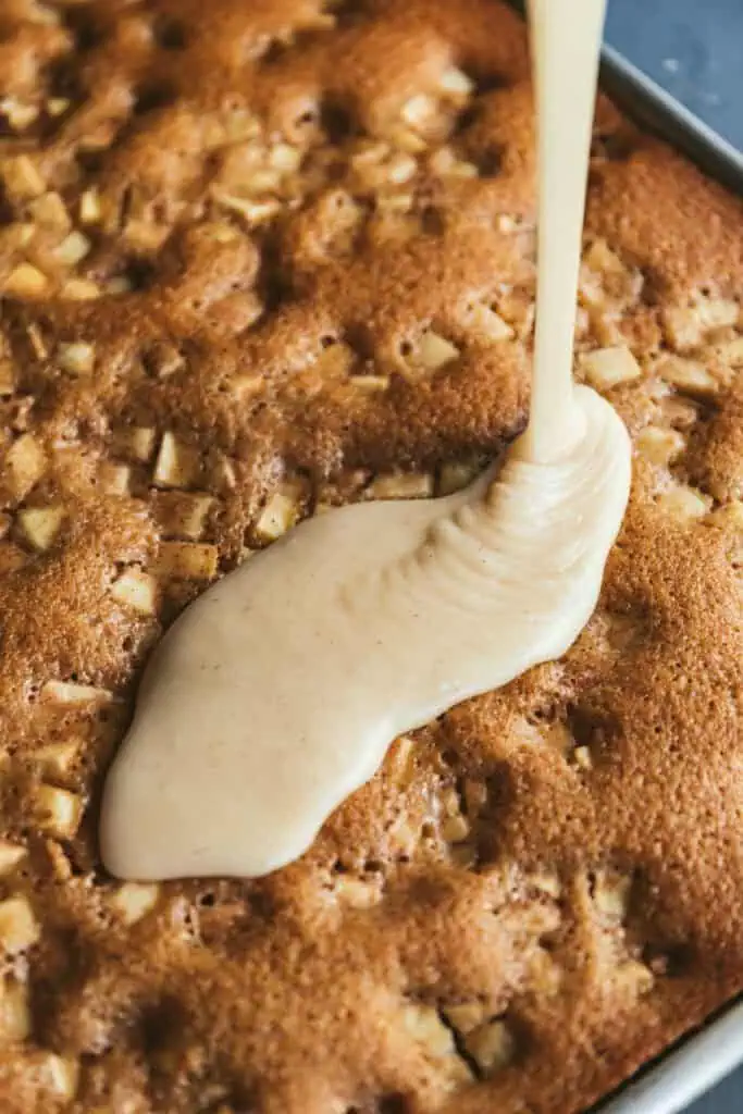 8. Glaze While Hot. As soon as the cake comes out of the oven, pour the warm glaze evenly over the hot cake. Use an offset spatula to spread it all the way to the edges. The glaze will seep into the top layer and create that shiny, sweet finish.