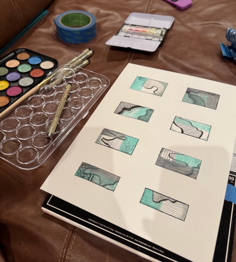 I put down painter’s tape on watercolor paper and then outlined the boxes and drew my own wild map borders.