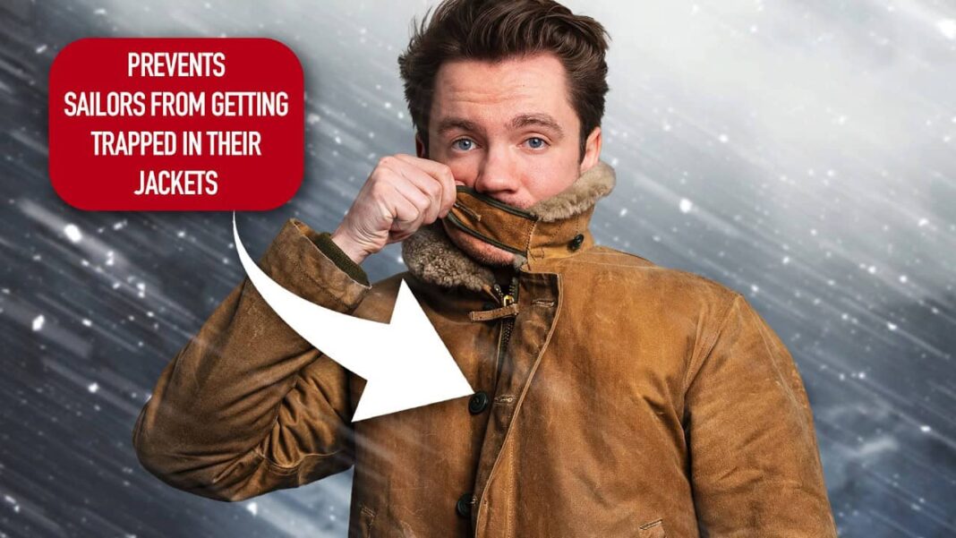 This version of the jacket was good but still not 100% perfect. It’s just because there’s still metal on the outside, so you still have the same base issue. Also, there were some other problems with the jacket. One of them was the exposed storm cuffs, which were getting caught on things that sailors were trying to move and stuff, so that would also rip the jacket, be inconvenient, and be very dangerous as well.